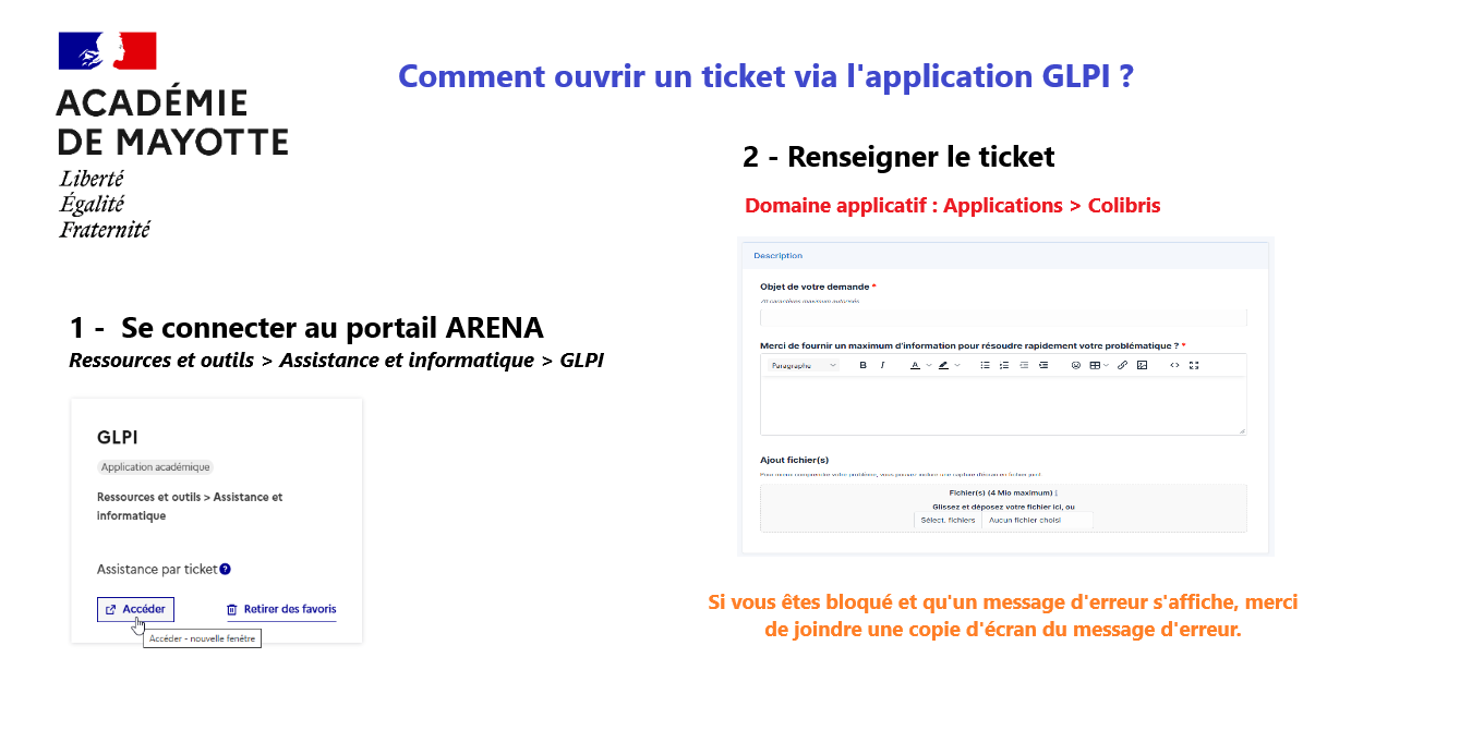 Si vous rencontrez des problèmes de connexion ou des difficultés techniques, nous vous invitons à faire un ticket GLPI (support d’assistance informatique présent sur le portail ARENA). Il faudra indiquer la catégorie « Application > Colibris » et joindre une capture d’écran pour faciliter le traitement de votre demande. Vous pouvez également vous adresser à votre service informatique.